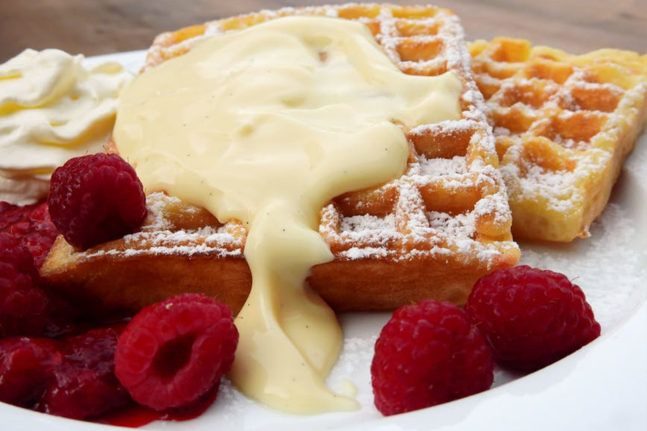 Sweet and smooth Waffles covered with honey, sweet cream and mixed blackberries, along with bacon and milk snow blend.
